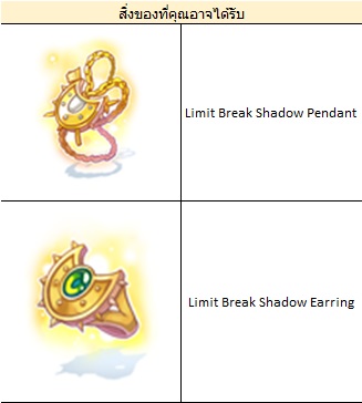 - เมื่อเปิด Limit Break Box จะมีโอกาสได้รับ Limit Break Shadow Pendant หรือ Limit Break Shadow Earring
