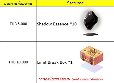 - เมื่อยอดเติมเงินสะสมครบ 5,000 บาท รับ S. Enchant Essence และเมื่อครบ 10,000 บาท รับ Limit Break Box